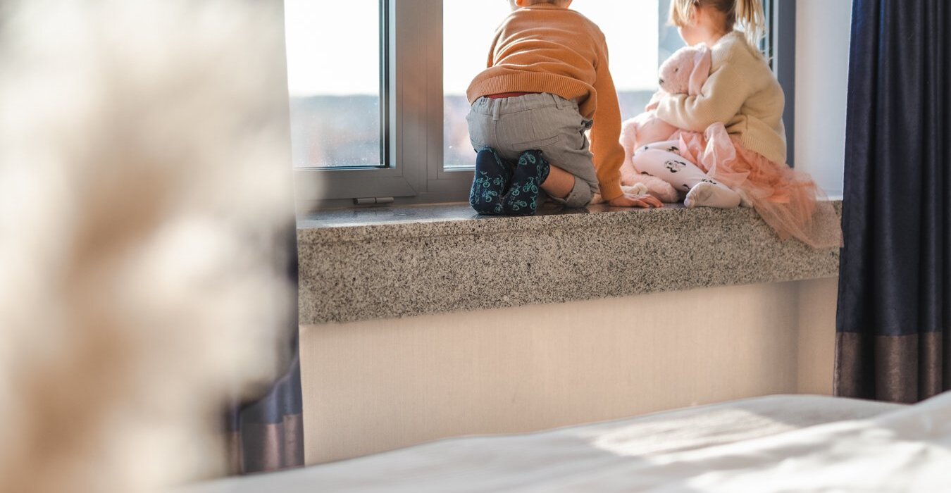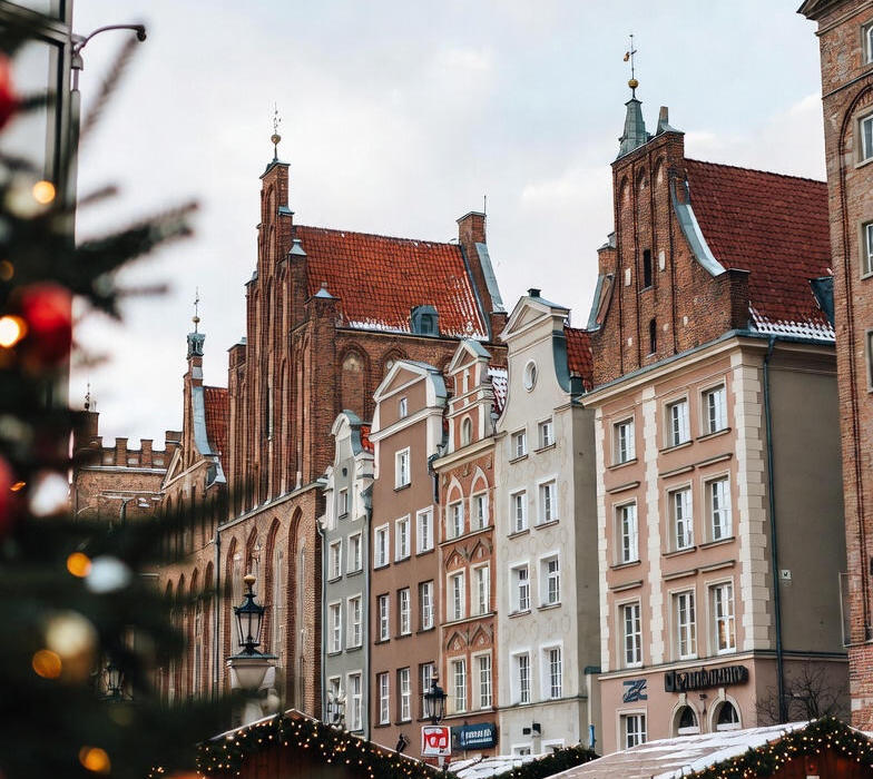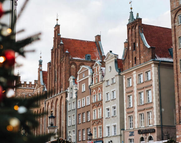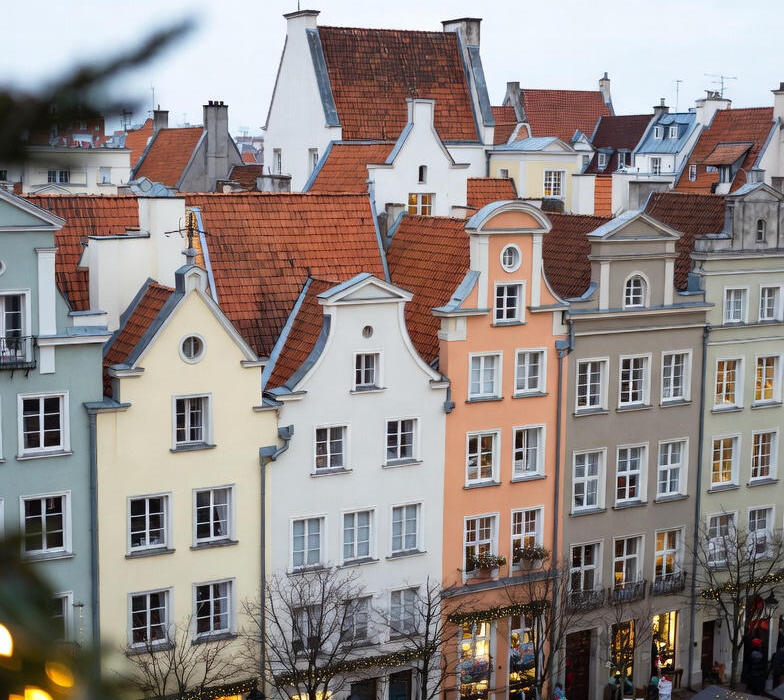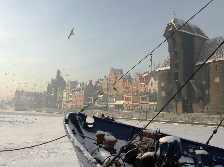 Podmanivý výhled na Staré Město a řeku Motława z pohodlí okna luxusního hotelového pokoje.