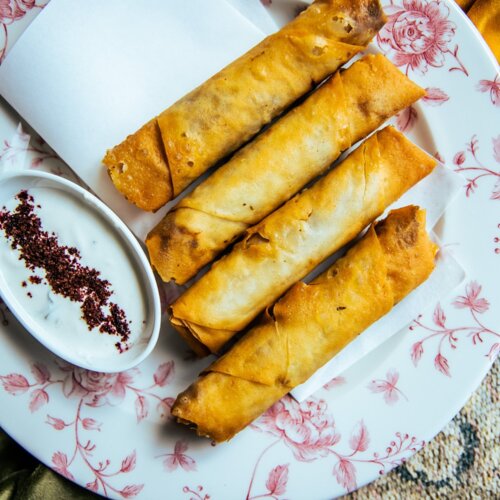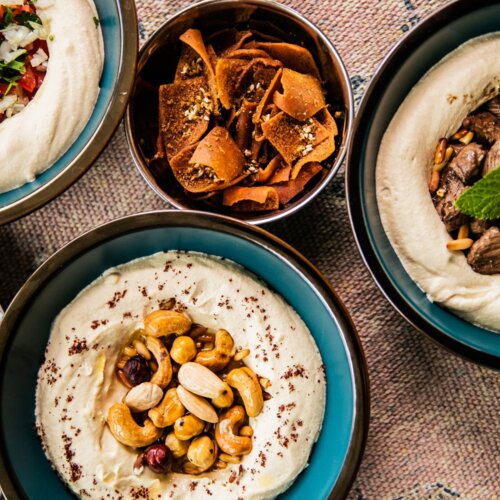 Sechs Teller mit orientalischen Gerichten auf einem Holztisch.