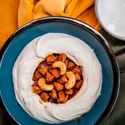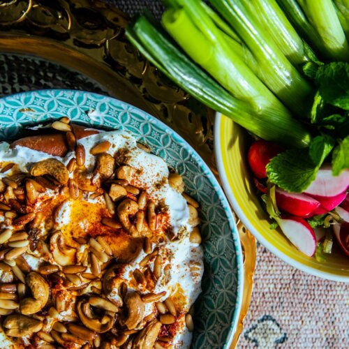 Eine Schüssel gefüllt mit Baba Ghanoush-Gericht, bestreut mit Granatapfelfrüchten.